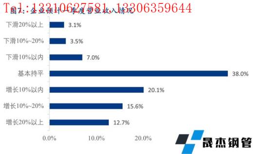 3、對(duì)于一季度營(yíng)業(yè)收入的情況,38.0%的企業(yè)預(yù)計(jì)一季度營(yíng)業(yè)收入與去年同期基本持平,48.3%的企業(yè)預(yù)計(jì)一季度營(yíng)業(yè)收入與去年同期相比有所增長(zhǎng),13.6%的企業(yè)一季度營(yíng)業(yè)收入同比下降,其中預(yù)計(jì)一季度營(yíng)業(yè)收入增幅20%以上及降幅20%以上的企業(yè)分別占比12.7%和3.1%。