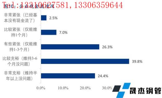據(jù)調(diào)研,64.1%的樣本企業(yè)資金流是比較或者非常充裕的,26.3%的樣本企業(yè)資金有些緊張,僅能維持1-3個(gè)月,而資金壓力比較及非常緊張的樣本企業(yè)占比9.6%。