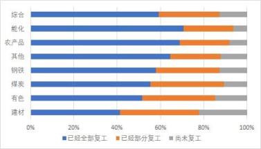 從未復(fù)工的企業(yè)調(diào)研情況來看,截至2月11日,計劃在2月7日-13日(節(jié)后第一周)復(fù)工的企業(yè)占比11.5%,計劃在2月14日-29日(節(jié)后第二周)復(fù)工的企業(yè)占比17.6%。預(yù)計節(jié)后兩周內(nèi),超九成企業(yè)都將完成復(fù)工,鋼鐵、能化、農(nóng)產(chǎn)品行業(yè)企業(yè)復(fù)工率預(yù)計達(dá)到93%以上。