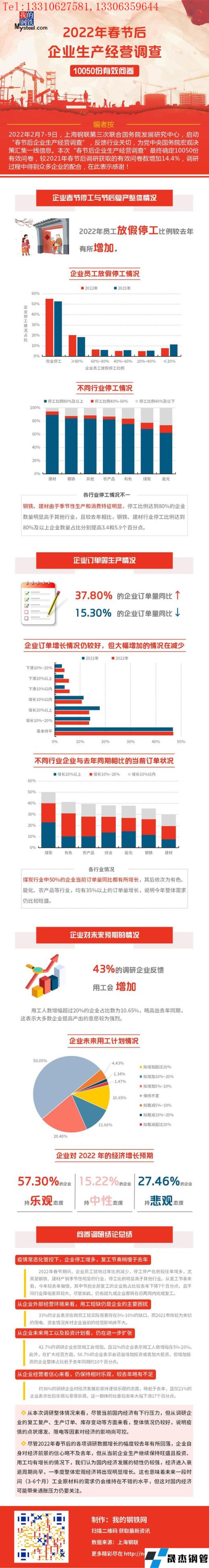 2022年2月7-9日,上海鋼聯(lián)第三次聯(lián)合國務(wù)院發(fā)展研究中心,啟動“春節(jié)后企業(yè)生產(chǎn)經(jīng)營調(diào)查”,反饋行業(yè)關(guān)切,為黨中央國務(wù)院宏觀決策匯集一線信息。本次“春節(jié)后企業(yè)生產(chǎn)經(jīng)營調(diào)查”最終確定10050份有效問卷,較2021年春節(jié)后調(diào)研獲取的有效問卷數(shù)增加14.4%。 具體結(jié)論如下:
