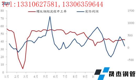 而對于2021年的數(shù)據(jù)來說無論是相關(guān)分析還是回歸分析結(jié)果表現(xiàn)出與其他年份有不同的結(jié)果,這與2021年的特殊情況有關(guān)。由于2021年螺紋鋼價格的急劇變化,導致電弧爐實際利潤具有了極強的波動性,而且由于能耗雙控,從8月底電弧爐無縫厚壁鋼管廠家被嚴格限產(chǎn),導致了電弧爐開工率有近20%左右的持續(xù)下降,創(chuàng)造了歷史低位,政策以及成材價格變動明顯干擾了數(shù)據(jù)的觀測,如下圖所示: