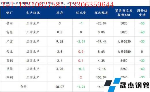 數(shù)據(jù):山東優(yōu)特?zé)o縫厚壁鋼管廠家?guī)齑?8.07萬(wàn)噸,環(huán)比增下降1.21萬(wàn)噸,減少4.13%,同比增加2.87萬(wàn)噸,增長(zhǎng)11.39%。