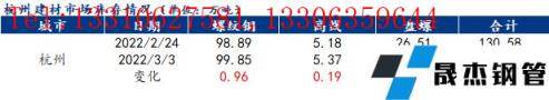 分品種來看,以杭州市場(chǎng)為例,本周杭州市場(chǎng)建筑厚壁無(wú)縫鋼管總庫(kù)存為130.25萬(wàn)噸,其中螺紋鋼庫(kù)存99.85萬(wàn)噸,周環(huán)比增加0.96萬(wàn)噸,增幅為0.97%;盤螺25.03萬(wàn)噸,周環(huán)比減少1.48萬(wàn)噸,降幅為5.58%;線材5.37萬(wàn)噸,周環(huán)比增加0.19萬(wàn)噸,增幅為3.67%。