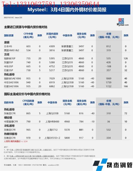 免責(zé)聲明:本網(wǎng)站(山東聊城晟杰無縫鋼管廠www.bfxzphq.cn)刊載的“2022年03月04日日?qǐng)?bào):國(guó)內(nèi)外鋼材_無縫鋼管價(jià)差匯總(2022.3.4)”等均源于網(wǎng)絡(luò),版權(quán)歸原作者所有,且僅代表原作者觀點(diǎn),本文所載信息僅供參考。轉(zhuǎn)載僅為學(xué)習(xí)與交流之目的,如無意中侵犯您的合法權(quán)益,請(qǐng)及時(shí)聯(lián)系刪除。本網(wǎng)站刊登此篇文章并不意味著本站贊同其觀點(diǎn)或證實(shí)其內(nèi)容的真實(shí)性,我們不對(duì)其科學(xué)性、嚴(yán)肅性等作任何形式的保證。如果侵犯了您的版權(quán),請(qǐng)盡快聯(lián)系我們予以撤銷,謝謝合作!