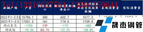 依據(jù)統(tǒng)計(jì)局發(fā)布數(shù)據(jù),2022年1-2月累計(jì)粗鋼產(chǎn)量同比降幅約10%左右,絕對量達(dá)到1.6億噸,去年同期約為1.8億噸;受今年國外形勢變化,鋼坯預(yù)估凈進(jìn)口同比增幅達(dá)到86%,厚壁無縫鋼管折算粗鋼凈出口降幅達(dá)到22%,因此測算粗鋼表觀消費(fèi)量達(dá)到1.55億噸,同比降幅約8.6%;另外考慮到庫存變化因素,將其折算至粗鋼,測算粗鋼實(shí)際消費(fèi)量達(dá)到1.44億噸,同比降幅約5%,需求降幅表現(xiàn)明顯好于市場預(yù)期。