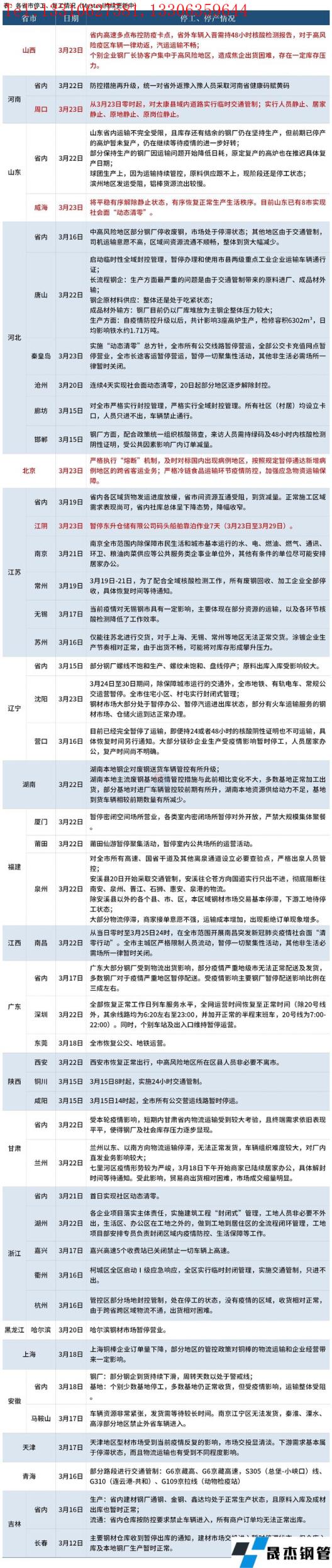 截至3月24日,匯總了20個省份停工復(fù)工最新信息。其中,3月23日,山西省內(nèi)高速多點布控防疫卡點,省外車輛入晉需持48小時核酸檢測報告,對于高風(fēng)險疫區(qū)車輛一律勸返,汽運運輸不暢;個別企業(yè)無縫厚壁鋼管廠家長協(xié)客戶集中于高風(fēng)險地區(qū),造成焦企出貨困難,存在一定庫存壓力。河南周口從3月23日零時起,對太康縣域內(nèi)道路實行臨時交通管制;實行人員靜止、居家靜止、原地靜止、原崗位靜止。山東威海于3月23日將平穩(wěn)有序解除靜止?fàn)顟B(tài),有序恢復(fù)正常生產(chǎn)生活秩序,目前山東已有8市實現(xiàn)社會面“動態(tài)清零”。具體情況如下: