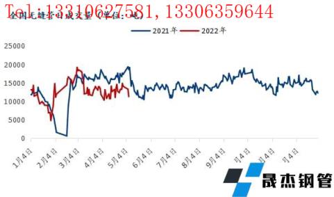 從4月份的成交數(shù)據(jù)來看,4月份國內(nèi)無縫管日均成交量在1.25萬噸,去年4月份整體日均成交在1.65萬噸,4月份成交量相較去年同期明顯減少,而進入5月份無縫管需求量整體偏低,日前無縫管日成交量處于1.1萬噸的水平,在預(yù)期中,市場原本可能被釋放的需求還是未得到釋放,供需兩弱格局延續(xù),短期來看5月強預(yù)期“不強”。由于目前市場還是處于供需雙緊的情況,所以無縫管的價格還能保持相對堅挺。
