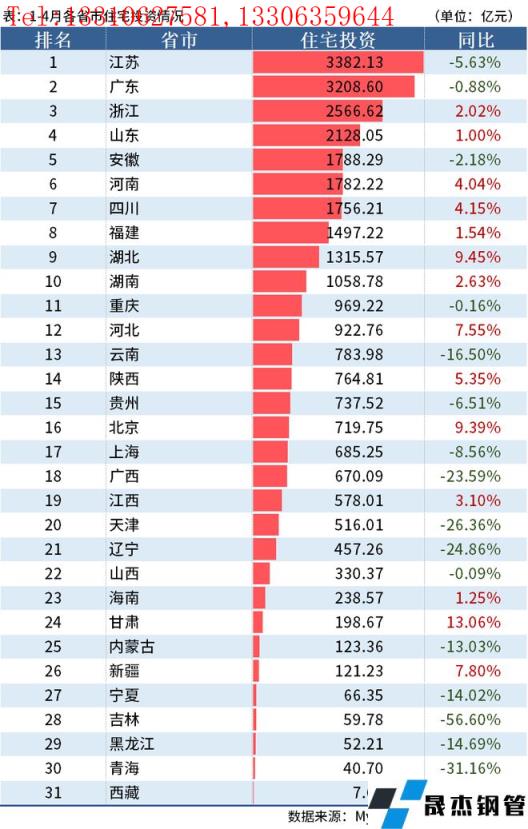 住宅投資方面,投資額超千億的有10個(gè)省市,其中江蘇、廣東和浙江分別以3382.13億元、3208.6億元、2566.62億元的投資額位排名前三。累計(jì)同比方面,有10個(gè)省市同比降幅超10%,其中降幅最大的依然是吉林省,同比下降56.6%;同比增幅超10%的僅有甘肅一省,同比增長(zhǎng)13.06%。