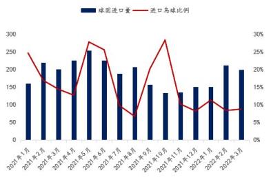 (1)進(jìn)口供應(yīng):俄烏沖突下,烏克蘭海運(yùn)出口清零,同時(shí)在中國(guó)球團(tuán)進(jìn)口量中,進(jìn)口烏克蘭球團(tuán)比例近兩年均值僅有16%,2021年二季度及2022年1-2月份,進(jìn)口比例更是只有8%-11%。所以雖然烏克蘭海運(yùn)出口被限,但對(duì)于中國(guó)國(guó)內(nèi)進(jìn)口球團(tuán)總量影響有限,環(huán)比當(dāng)前情況來(lái)看很難出現(xiàn)明顯下降趨勢(shì)。