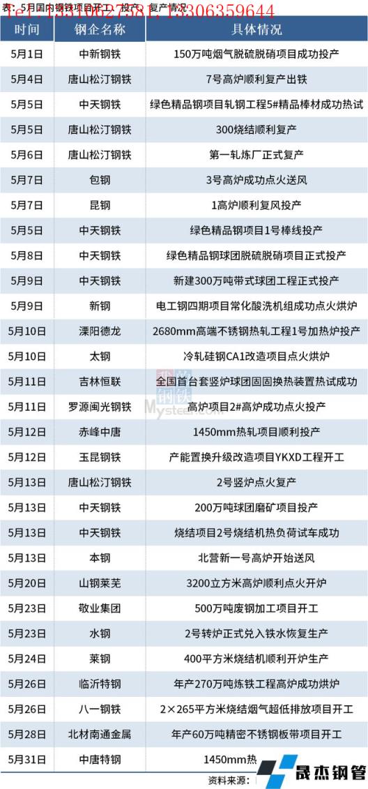 據(jù)不完全整理,2022年5月國(guó)內(nèi)有29個(gè)鋼鐵項(xiàng)目開工、投產(chǎn)或復(fù)產(chǎn)。其中,玉昆鋼鐵、敬業(yè)集團(tuán)、八一鋼鐵和北材南通金屬等4個(gè)鋼鐵相關(guān)項(xiàng)目開工;中新鋼鐵、昆鋼、中天鋼鐵和溧陽(yáng)德龍等10個(gè)鋼鐵相關(guān)項(xiàng)目投產(chǎn),具體內(nèi)容如下: