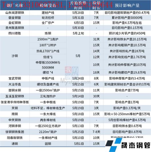 據不完全統計,5月國內18家無縫厚壁鋼管廠家發(fā)布檢修計劃。其中,磐金厚壁鋼管各分廠計劃將于5月31日至6月6日進行輪流檢修,預計將累計影響產量50000噸。