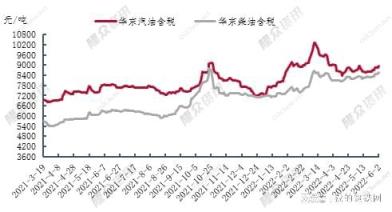從華東江里汽柴油船單價(jià)格來看:6月初汽油均值為8925元/噸,環(huán)比上月8713元/噸的均值,上漲213元/噸,漲幅2.44%。而柴油6月初均值為8525元/噸,環(huán)比上月8339元/噸的均值,上漲186元/噸,漲幅2.23%。見上圖1。