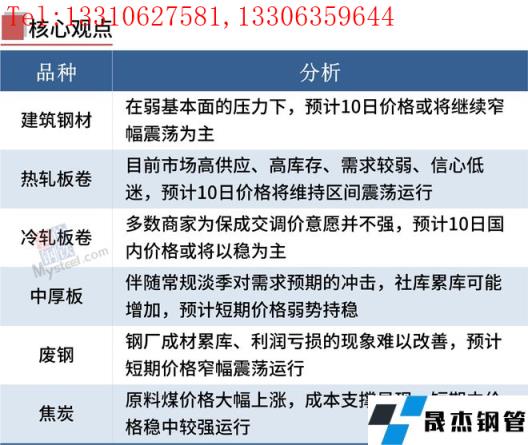 建筑厚壁無(wú)縫鋼管:6月9日,全國(guó)31個(gè)主要城市20mm三級(jí)抗震螺紋鋼均價(jià)4838元/噸,較上個(gè)交易日漲3元/噸。產(chǎn)業(yè)數(shù)據(jù)方面,本周螺紋鋼產(chǎn)量小幅增加,庫(kù)存方面,雖然廠庫(kù)下降,但社庫(kù)出現(xiàn)回升,同時(shí)在雨季影響下,需求端整體低迷。短期來(lái)看,目前市場(chǎng)需求恢復(fù)狀況不及預(yù)期,南方汛期疊加高考日影響,下游需求整體低迷,且投機(jī)性需求較差。因此短期在弱基本面的壓力下,預(yù)計(jì)10日國(guó)內(nèi)建筑厚壁無(wú)縫鋼管價(jià)格或?qū)⒗^續(xù)窄幅震蕩為主。