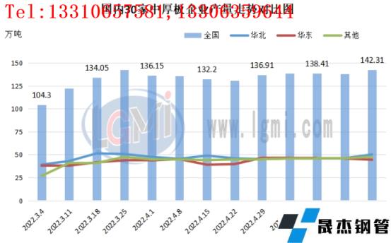 截止2022年5月27日,據(jù)云商平臺監(jiān)測數(shù)據(jù)顯示,國內中厚板社會庫存量約為115.5萬噸,環(huán)比增加1.6萬噸左右,月同比增加10.4萬噸左右,年同比增加約2.9萬噸左右。5月份30家樣本鋼企庫存量呈現(xiàn)持續(xù)增長走勢,截止5月27日,追蹤國內30家中板鋼企庫存量約為46.6萬噸,與4月份相比基本持平,其中華北區(qū)域14家樣本企業(yè)廠內庫存約為22.7萬噸,同比4月份同期增加約5.5萬噸左右,華東區(qū)域12家樣本企業(yè)廠內庫存約為15.2萬噸,同比4月份同期下降約2萬噸左右,除華北、華東區(qū)域外,11家樣本企業(yè)廠內庫存約為8.7萬噸,同比4月份同期基本持平。