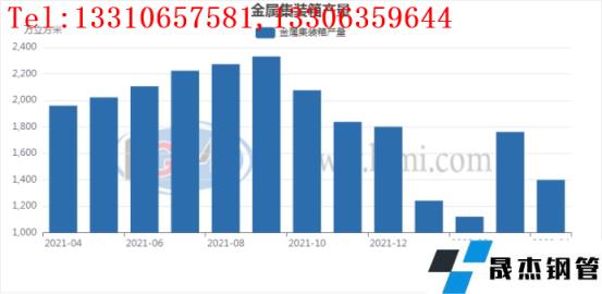 國內下游產(chǎn)品供應分品種來看,4月份國內金屬集裝箱產(chǎn)量為1398.4萬立方米,環(huán)比3月份增產(chǎn)約363.3萬立方米。同比21年同期下降約561.9萬立方米。