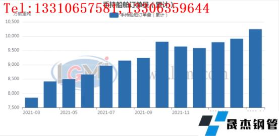 4月份國內手持船舶訂單量累計為10247萬載重噸,環(huán)比3月份增長約337萬載重噸。同比21年同期增加約1828萬載重噸。
