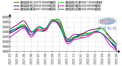 據(jù)云商平臺監(jiān)測數(shù)據(jù)顯示,截至6月30日,全國十大主導城市碳結(jié)鋼(45#)平均價格4848元,較年初跌398元。合結(jié)鋼(40Cr)平均價格5097元,較年初跌363元。